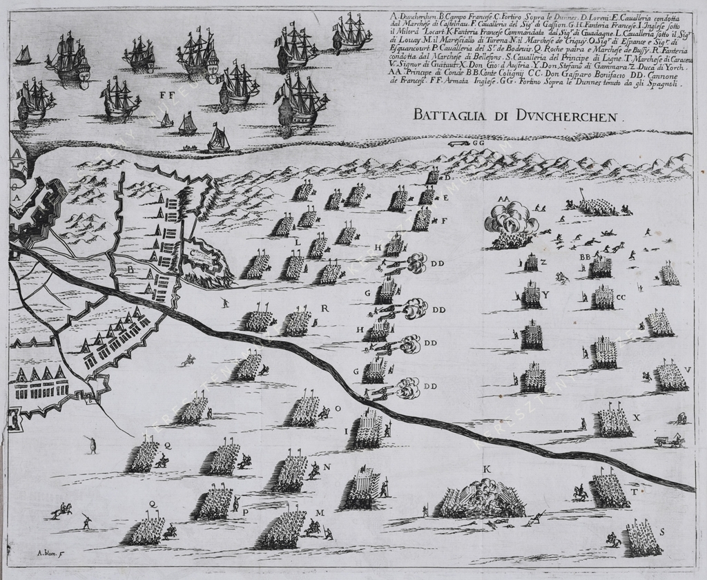A-GG. A. Duncherchen. B. Campo Francese. C. Fortiro (sic) Sopra le Dunnes […] FF. Armata Inglese. GG. Fortino Sopra le Dunnes tenuto da gli Spagnoli.