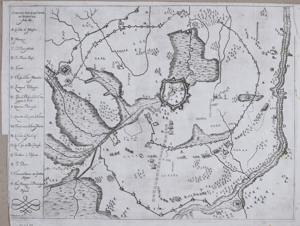 A. La Città di Münster. B. Marazzo. C. Il Fiume AHA. D. Il Fiume Bese. […] S. Circonvallatione con fortini, e Ridotti. T. Sua Altezza il Principe Vescovo.