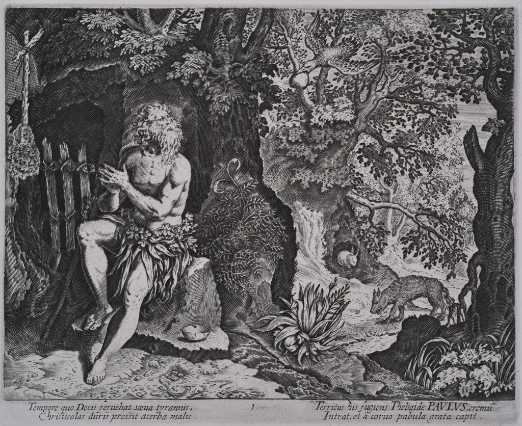 A nagyszakállú, ruha gyanánt levelekből font ágyékkötőt viselő remete baloldalt, a barlangja bejáratánál ül a hangulatos, kedves részletekkel teli, európai jellegű erdőben. Tekintetét a hollóra emeli, aki sietve érkezik a napi kenyér-adaggal jobb felől. Dús a vegetáció a remetelak körül a szikla mögött fakadó forrásnak köszönhetően, amelynek vize patakként kanyarog tova. Az erdei állatok – a fa odvában ülő nyúl és a patakhoz igyekvő farkas – nyugodtan végzik mindennapi tevékenységüket. A kép alatti sáv rímes felirata tömören elbeszéli a keresztényüldözések miatt a remeteéletet választó thébai Pál történetét. A két szöveghasáb közti 1-es szám jelzi, hogy a lap egy sorozat első darabja. Csakugyan így is van: az eredetileg Maarten de Vos (Antwerpen, 1532 - 1603) által rajzolt, Jan és Raphael Sadeler által metszett és még 1600 előtt Münchenben kiadott, harminclapos (huszonkilenc lapból és egy címlapból álló) Solitudo Sive Vitae Patrum Eremicolarum című sorozat egyik későbbi, oldalfordított másolatban megjelent változatából származik ez a metszet. Az eredeti ugyanis, négy hasonló témájú társával, amelyekkel sok esetben egy kötetbe kötötték, roppant népszerű lett. A nyomólemezeket azonban a Sadeler-család őrizte, kizárólagos joggal az utánnyomásra és kiadásra. Így az okkal jó üzletet szimatoló későbbi kiadó-vállalkozók a következő bő száz év során csakis a már megjelent lapok alapján készíttethették el saját verzióikat, immár a saját nevük alatt. Így tett a Rómában 1693-tól Giovanni Giacomo de Rossi örököseként működő Domenico de Rossi is, aki új címlappal, és teljesen újrametszett, ám az előképekhez az oldalirányon kívül a lehető legpontosabban ragaszkodó lapokkal publikálta a művet. Minthogy a sorozat szerepel az üzletében kapható rézmetszetek 1714-es jegyzékében, legkésőbb ebben az évben készült el a másolat. (Sebő Judit, 2021)