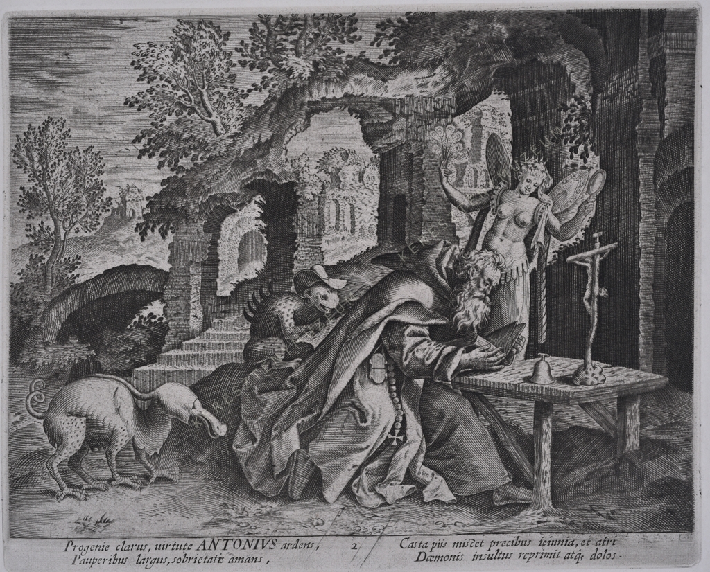 Progenie clarus, uirtute ANTONIVS ardens, Pauperibus largus, sobrietatis amans, Casta piis miscet precibus ieiunia, et atri Daemonis insultus reprimit atque dolos.