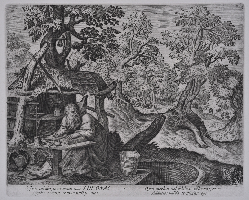 Officio calami, taciturnus uoce THEONAS Iugiter erudijt commonuitque suos. Quos morbus uel debilitas afflixerat, ad se Adductos ualida restituebat ope.
