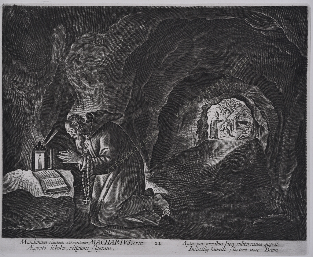 Mundarum fugiens strepitum MACHARIVS, orta Aegypto soboles, religione flagrans, Apta piis precibus loca subterranea quaerit, Insistitque humili flectere uoce Deum.