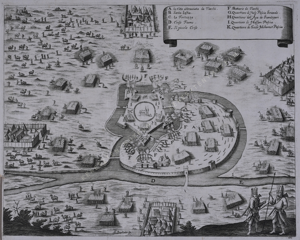A. La Citta abbrucciata da Turchi. B. Santa Lastia. C. La Fortezza. D. Criso Fiume. E. Il piccolo Criso. F. Battarie de Turchi ; G. Quartiero di Haly Pascia Generale. H. Quartiero dell'Aga di Gianizzari. I. Quartiero di Hassan Pascia. K. Quartiero di Seidi Mehumet Pascia.