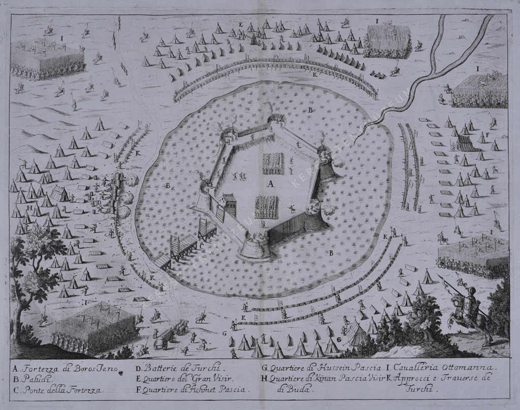 A. Fortezza di Boros Jeno. B. Paludi. C. Ponte della Fortezza. D. Batterie de Turchi. E. Quartiero del Gran Visir. F. Quartiere di Achmet Pascia. G. Quartiere di Hussein Pascia. H. Quartiere di Kinan Pascia Visir di Buda. I. Caualleria Ottomanna. K. Approcci e Trauerse de Turchi.