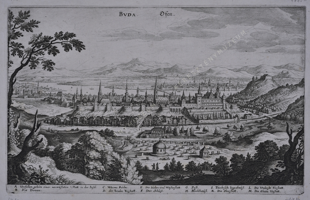 A. Verfallen gebäw einer verwüsteten Statt in der Insel. B. Die Donaw: C. Warme Bäder. D. die hinder Vorstatt. E. Die Iuden und Waßerstatt. F. Das Schloß. G. Pest. H. Blochhaus. I. Türckisch begrebnüß. K. Die Oberstatt. L. Die Vnderste Vorstatt. M. Die Obere Vorstatt.