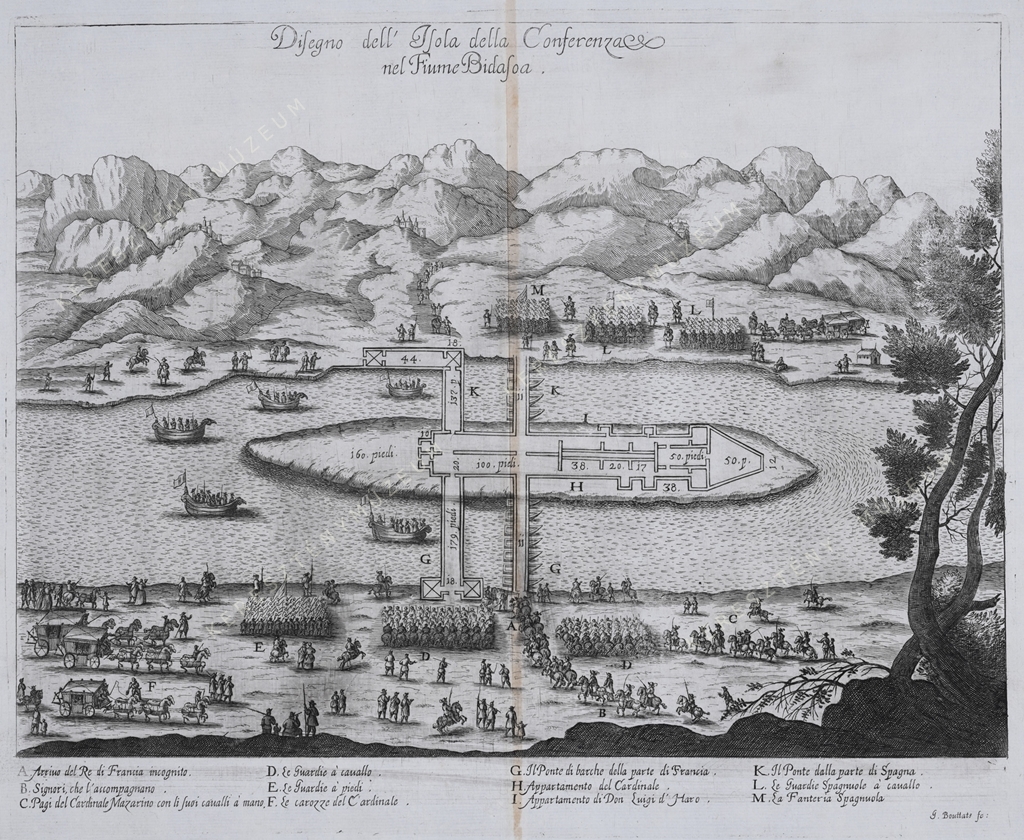 A. Arrivo del Re di Francia incognito. B. Signori, che l'accompagnano. C. Pagi del Cardinale Mazarino con li suoi caualli a mano. […] K. Il Ponte dalla parte di Spagna. L. Le Guardie Spagnuole a cavallo. M. La Fanteria Spagnuola.