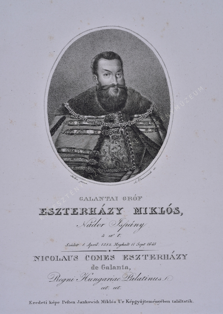 Nádor Ispány 's a' t. Szület. 8. April. 1582. Meghalt 11. Sept 1645. / NICOLAUS COMES ESZTERHÁZY de Galanta, Regni Hungariae Palatinus cet.cet.