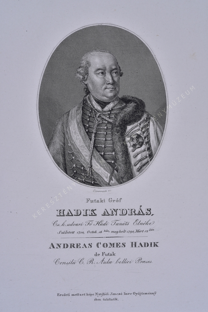 Cs. k. udvari Fő Hadi Tanáts Elnöke Született 1710. Octob. 16kán, megholt 1790. Mart. 12kén. / ANDREAS COMES HADIK de Futak Consilii C. R. Aulae bellici Praeses.
