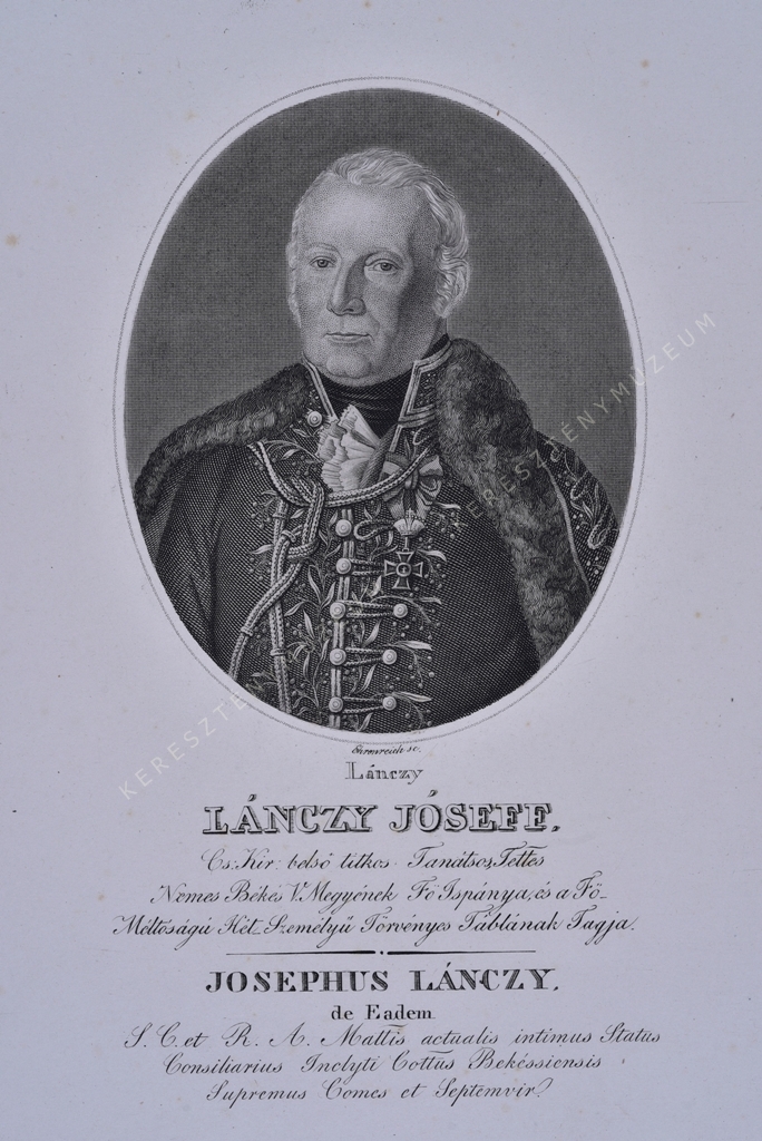 Cs. Kir. Belső titkos Tanátsos, Tettes Nemes Békés V.Megyének Fő Ispánya, és a Fő-Méltóságú Hét Személyű Törvényes Táblának tagja. / JOSEPHUS LÁNCZY de Eadem, S. C. et R. A. Mattis actualis intimus Status Consiliarius Inlcyti Cottus Békéssiensis Supremus Comes et Septemvir.
