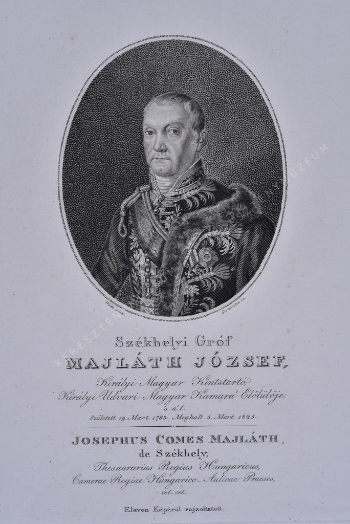Királyi Magyar Kintstartó, Királyi Udvari magyar Kamara' Előlülője. Született 19. Mart. 1763. Meghalt 8. Mart. 1825. / JOSEPHUS COMES MAJLÁTH de Székhely, Thesaurarius Regius Hungaricus, Camerae Regiae Hungarico-Aulicae Praeses, cet.cet.
