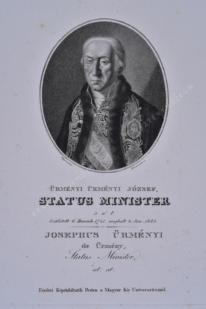 s a' t. Született 6. Decemb. 1741. meghalt 8. Jun. 1825. / JOSEPHUS ÜRMÉNYI de Ürmény, Status Minister, cet.cet.