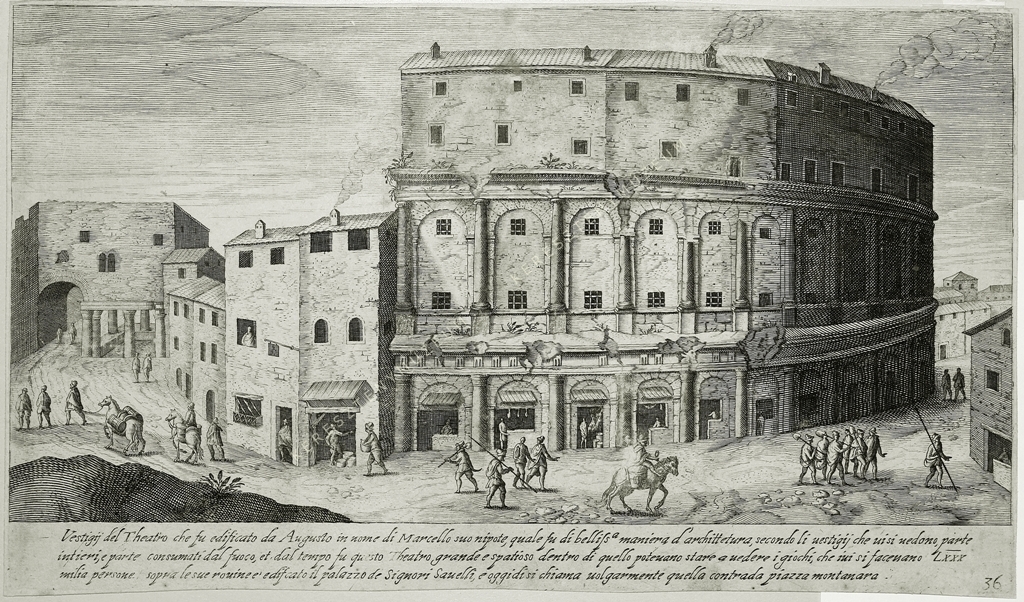 Vestigij del Theatro che fu edificato da Augusto in nome di Marcello suo nipote, quale fu di bellss.a maniera d'architettura, secondo le uestigij che ui si uedono, parte intieri, e parte consumati dal fuoco, et dal tempo fu questo Theatro grande e spatioso dentro di quello poteuano stare a uedere i giochi, che iui si faceuano LXXX milia persone sopra le sue rouine e' edificato il palazzo de Signori Sauelli, e oggidi si chiama uolgarmente quella contrada piazza montanara.