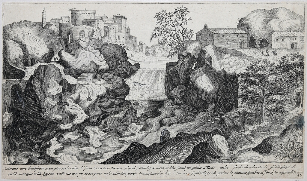 Cataratta ouero luocho stretto et precipitoso per la caduta del fiume Aniene hora Teuerone, il quale passando per mezo le selue scende poi gionto a Tiuoli molto straboccheuolmente da gl'alti giuogi di quelle montagne nella soggetta ualle oue per un pezzo parte nascondendosi parte trauagliandosi sotto o tra certi scogli allagando prima la pianura sgombra al fine le sue acque nello Teuere.