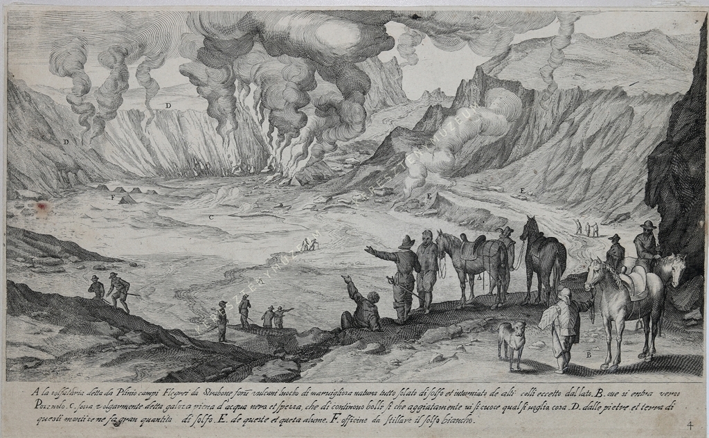 A la solfataria detta da Plinio campi Flegrei da Strabone foru(m) vulcani luocho di marvigliosa natura tutto solato di solfo et intorniato de alti colli eccetto dal lato B. oue si entra verso Pozzuolo. C. fossa volgarmente detta galoza piena d'acqua nera et spessa, che di continouo bolle si che aggiatamente ui si cuoce qual si uoigla cosa. D. dalle pietre et terra di questi monti se ne fa gran quantita di solfo. E. de queste et queta alume. F. officine di stillare il solfo biancho.