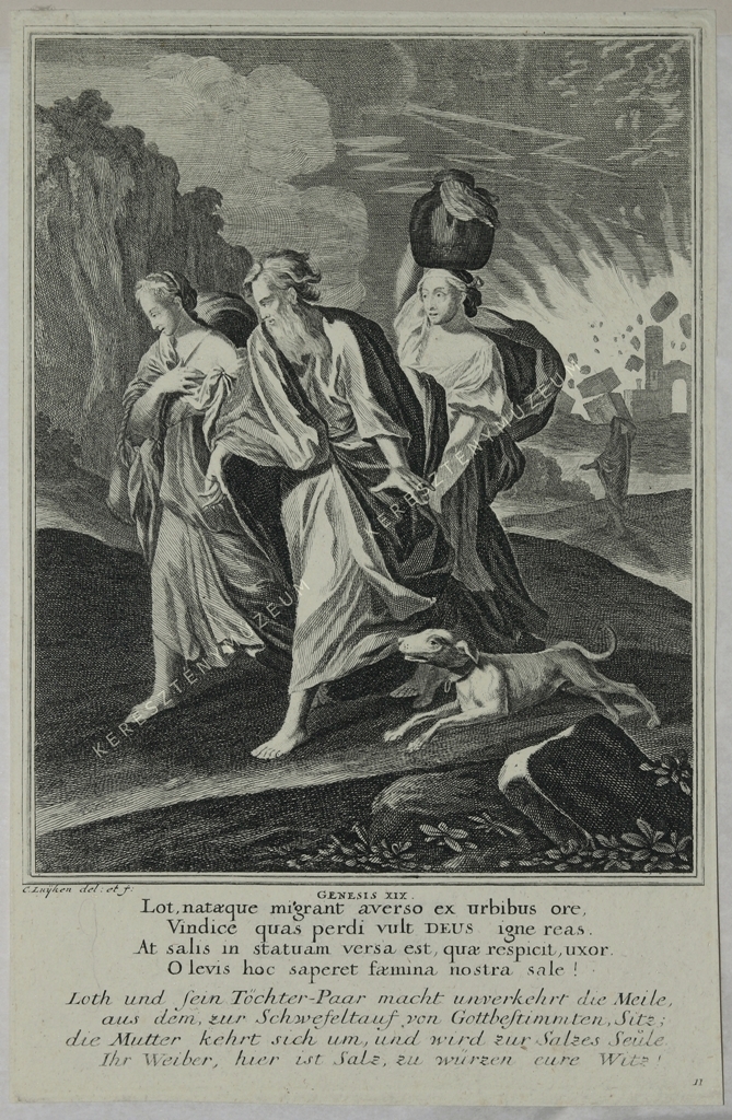 GENESIS XIX. Lot, nataeque migrant averso ex urbibus ore, / Vindice quas perdi vult DEUS igne reas. / At salis in statuam versa est, quae respicit, uxor. / O levis hoc saperet faemina nostra sale! // Loth und sein Töchter-Paar macht unverkehrt die Meile / aus dem, zur Schwefeltauf von Gottbestimmten, Sitz; / die Mutter kehrt sich um, und wird zur Salzes Seüle / Ihr Weiber, hier ist Salz, zu würzen eure Witz! | lent jobbra oldalszám: 11.