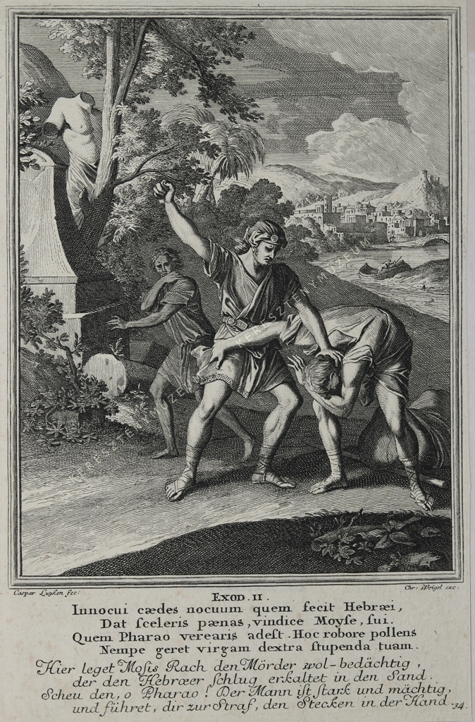 EXOD. II. Innocui caedes nocuum quem fecit Hebraei, / Dat sceleris paenas, vindice Moyse, sui. / Quem Pharao verearis adest. Hoc robore pollens / Nempe geret virgam dextra stupenda tuam. // Hier leget Mosis Rach den mörder wol-bedächtig, / der den Hebraeer schlug arkaltet in den Sand. / Scheu den, o Pharao! der Mann ist Stark und mächtig, / und führet, dir zur Straf, den Stecken in der Hand. | Jobbra lent oldalszám: 34.