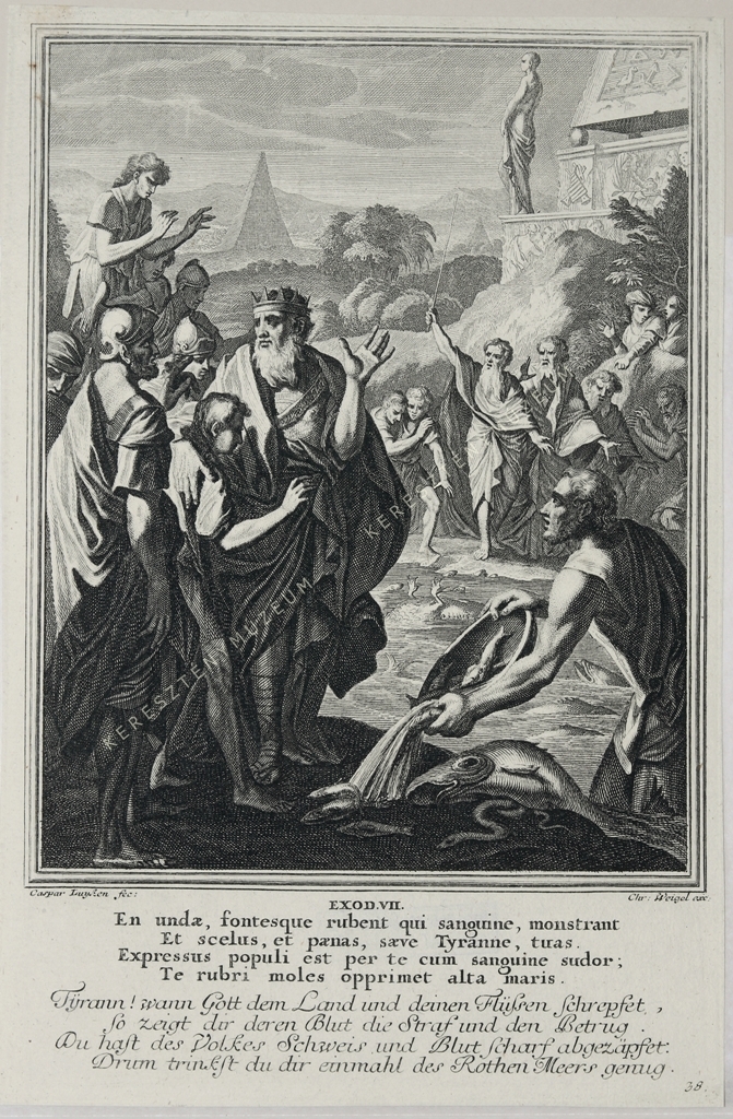 EXOD. VII. En undae, fontesque rubent qui sanguine, monstrant / Et scelus, et paenas, saeve Tyranne tuas. / Expressus populi est per te cum sanguine sudor; / Te rubri moles opprimet alta maris. // Tyrann! Wann Gott dem Land und deinen Flüssen schrepfet, / so zeigt dir deren Blut die Straf und den Betrug. / Du hast des Volkes Schweis und Blut scharf abgezäpfet / Drum trinkst du dir einmahl des Rothen Meers genug. | lent jobbra oldalszám: 38.