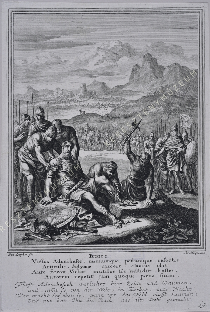 IUDIC. I. Victus Adonibesec, manuumque, pedumque resectis / Articulis, Solymae carcere clausus obit. / Ante ferox victor mutilos hic reddidit hostes: / Autorem repetit jam quoque poena suum. // Fürst Adonibesech verliehrt hier Zehn und Daumen, / und nim(m)t so von der Welt, im Kerker, gute Nacht. / Vor macht' Ers eben so, wann wer das Feld muss raumen, / Und nun hat Ihm die Rach das alte Wett gemacht. | jobbra lent oldalszám: 59
