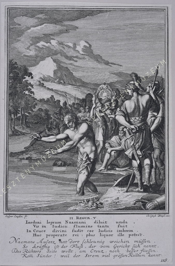 II. REGUM V. Iordani lepram Naamani diluit unda, / Vis in Iudicii flumine tanta fuit. / In Cruce divini fudit cor Iudicis imbrem. / Huc properate rei: plus liquor ille potest. // Naemans Ausatz hat dort schleunig weichen müssen. / So kräfftig ist der Fluß, der vom Gericht sich nennt. / Des Richters Seite wollt, am Creuz, noch besser fliessen. Kom(m) Sünder! weil der Strom viel grössers Heiltum kennt. | jobbra lent oldalszám: 118
