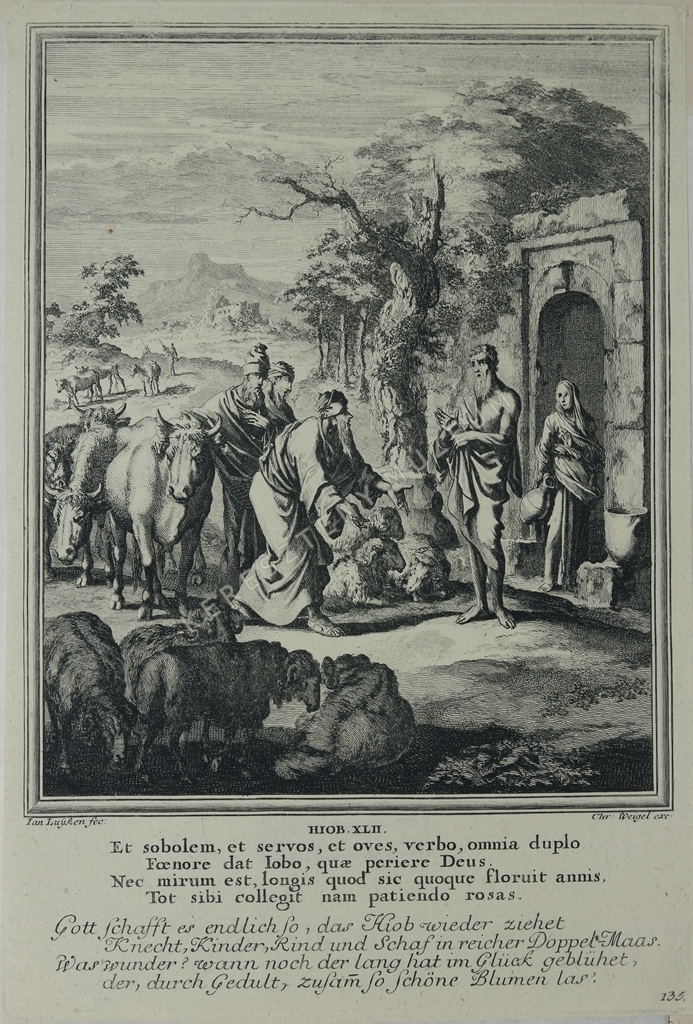 HIOB. XLII. Et sobolem, et servos, et oves, verbo, omnia duplo / Foenore dat Iobo, quae periere Deus. / Nec mirum est, longis quod sic quoque floruit annis / Tot sibi collegit nam patiendo rosas. // Gott schafft es endlich so, das Hiob wieder ziehet / Knecht, Kinder, Rind und Schaf in reicher Doppel-Maas. / Was wunder? Wann noch der lang hat im Glück geblühet, / der, durch Gedult, zusam(m) so schöne Blumen las'. | jobbra lent oldalszám: 135