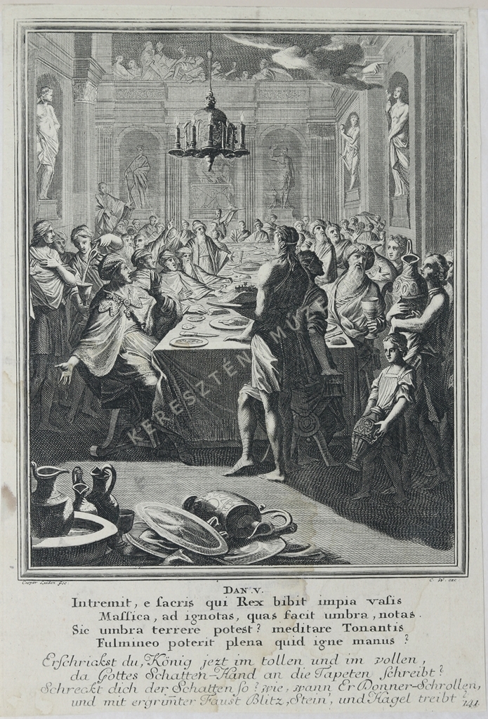 DAN. V. Intremit, e sacris qui Rex bibit impia vasis / Massica, ad ignotas, quas facit umbra, notas. / Sic umbra terrere potest? Meditare Tonantis / Fulmineo poterit plena quid igne manus? // Erschrickst du, König jetzt im tollen und im vollen, / da Gottes Schatten-Hand an die Tapaten schreibt? / Schreckt dich der Schatten so? wie, wann Er Donner-Schrollen, / und mit ergrim(m)ter Faust Blitz, Stein', und Hagel treibt? | jobbra lent oldalszám: 141