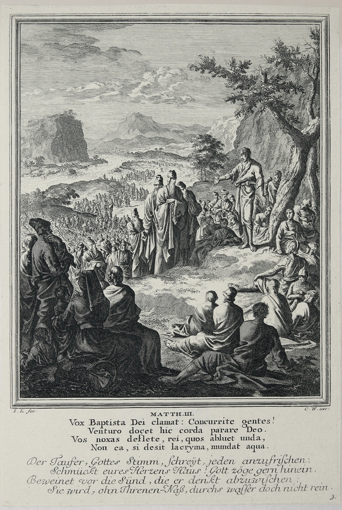 MATTH. III: Vox Baptista Dei clamat: Concurrite gentes! / Venturo docet hic corda parare Deo. / Vos noxas deflete, rei, quos abluet unda, / Non ea, si desit lacryma, mundat aqua. // Der Taufer, Gottes Stimm, schrezt, jeden anzufrischen: / Schmückt eures Herzens Haus! Gott zöge gern hinein. / Beweinet vor die Sünd, die er denkt abzuwischen: / Sie wird, ohn Threnen-Naß, durchs wasser noch nicht rein. | jobbra lent oldalszám: 3