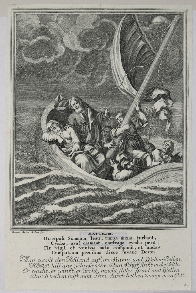 MATTH. VIII: Discipuli Somnum Iesu, turba anxia, turbant / Cymba, juva! Clamant, naufraga cymba perit! / Fit vigil et ventos nutu componit, et undas: / Compulsum precibus disce juvare Deum. // Man weckt den Heiland auf, im Sturm und Wellen-Bellen. / HERR, hilf uns! schreyen Sie: Dein Schiff sinkt in der Noth! / Erwacht, er winkt, er droht, macht stiller Wind und Wellen. / Durch bethen hilft man Ihm, durch bethen zwingt man Gott. | jobbra lent oldalszám: 8