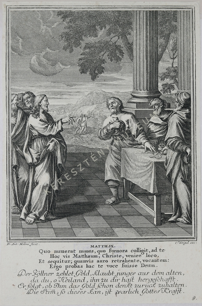 MATTH. IX. Quo numerat numos, quo foenora colligit, ad te / Hoc vis Matthaeum, Christe, venire loco, / Et sequitur; quamvis auro retrahente, vocantem: / Ergo probas hac te voce fuisse Deum. // Der Zöllner zehlet Geld, klaubt junges aus dem alten, / da du, o Heiland, ihn zu dir hast hergeschafft. / Er folgt, ob Ihm das Gold schon denkt zurück zuhalten. / Die Stim(m), so dieses kan, ist warlich Gottes Krafft. | jobbra lent oldalszám: 9