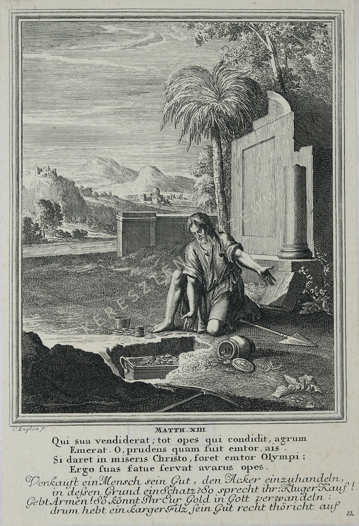 MATTH. XIII. Qui sua vendiderat; tot opes qui condidit, agrum / Emerat. O, prudens quam fuit emtor, ais / Si daret in miseris Christo, foret emtor Olympi / Ergo suas fatue servat avarus opes. // Verkauft ein Mensch sein gut, den Acker einzuhandeln, / in dessen Grund ein Schatz? So sprecht ihr: Kluger Kauf! / Gebt Armen! So könnt Ihr Eur Gold in gott verwandeln: drum hebt ein karger Filz sein Gut recht thöricht auf. | jobbra lent oldalszám: 12
