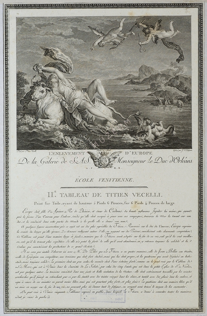 L'Enlevement d'Europe. De la Galerie de S.A.S. Monseigneur le Duc d'Orléans. École venitienne. II.e tableau de Titien Vecelli. Peint sur Toile, ayant de hauteur 5 Pieds 6 Pouces, sur 6 Pieds 4 Pouces de large.
