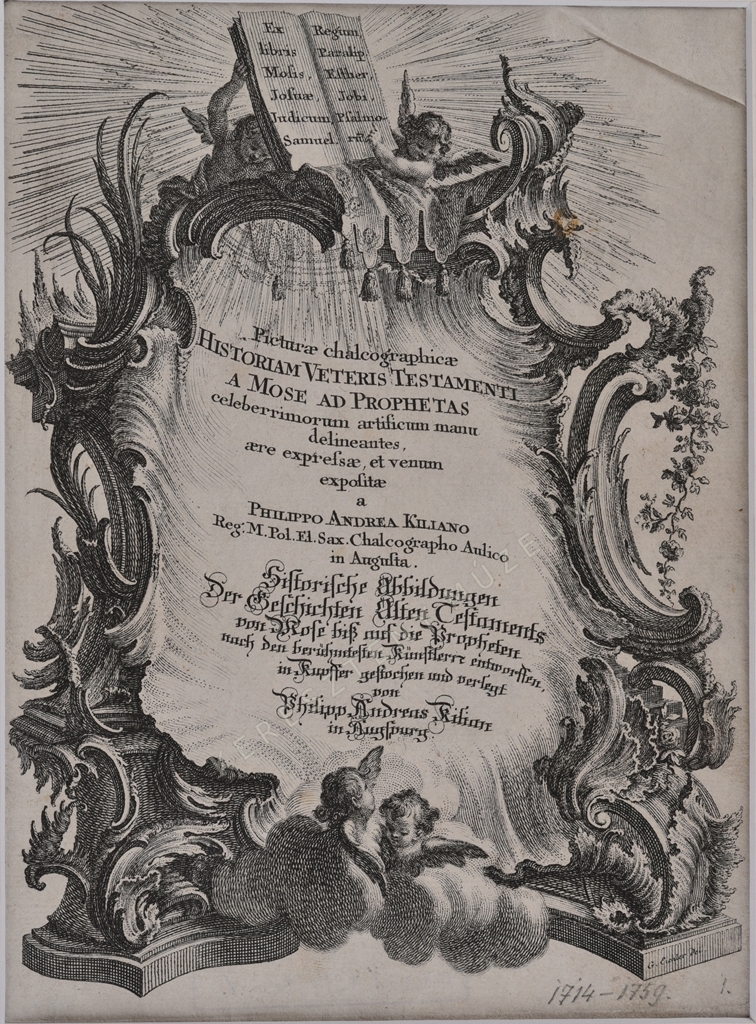 Picturae calchographicae Historiam Veteris Testamenti a Mose ad Prophetas celeberrimum artificum manu delineantes, aere expressae, et venum expolitae a Philippo Andrea Kiliano Reg. M. Pol. Et Sax. Chalcographo Aulica in Augusta. Historische Abbildungen Der Geschichten Alten Testaments von Mose biß auf die Propheten nach den berühmtesten Künstlern entworffen, in Kupffer gestochen und verlegt von Philipp Andreas Kilian in Augsburg. Ex libris Mosis, Josuae, Judicum, Samuel, Regum, Paralip, Esther, Jobi, Psalmoru(m). | lent ceruzával: 1714-1759; 1