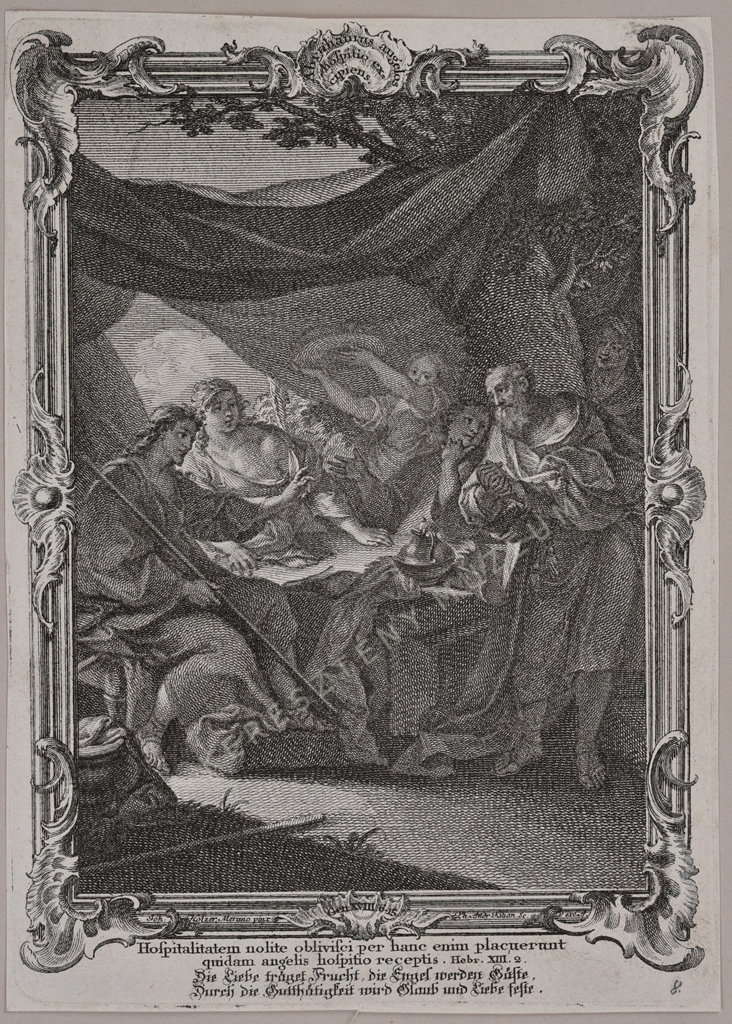 Abrahamus angelos hospitio excipiens. Hospitalitatem nolite oblivisci per hanc enim placuerunt quidam angelis hospitio receptis. Hebr. XIII. 2. Die Liebe träget Frucht, die Engel werden Gäste, Durch die Gutthätigkeit wird Glaub und Liebe feste. | Ceruzával: 8