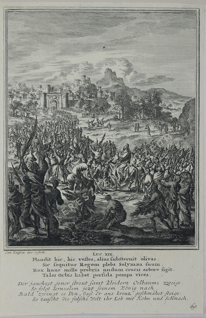 LUC. XIX. Plaudit hic, hic vestes, alius substernit olivas. / Sic sequitur Regem plebs Solymaea suum. / Mox hunc mille probris nudum crucis arbore figit. / Tales Orbis habet perfida pompa vices. // Der jauchzet, jener streut samt Kleidern Oelbaums zweige. / So folgt Ierusalem jezt seinem König nach. / Bald zwingt es Ihn, daß Er ans Kreuz geschmächet steige: / So tauscht die falsche Welt ihr Lob mit Hohn und Schmach. | jobbra lent képszám: 69