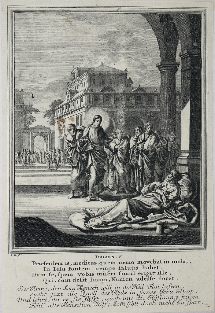 IOHANN V. Praesentem is, medicas quem nemo movebat in undas, / In Iesu fontem nempe salutis habet. / Dum se, spem vobis miseri simul erigit ille, / Qui, cum desit homo, Numen adesse docet. // Der Arme, den kein Mensch will in die Heil-Flut lassen, / sucht jezt die Quell des Heils in seines Jesu Rhat, / und lehrt, da er sie fässt, auch uns die Hoffnung fassen / Fehl' alle Menschen-Hilf; kom(m) Gott doch nicht zu spat. | jobbra lent képszám: 74