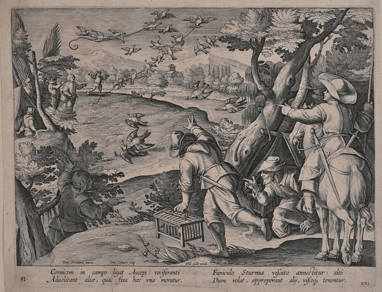 Cornicem in campo ligat Auceps: vociferanti / Aduolitant aliae, quas fixa haec una moratur. / Funiculo Sturnus viscato anncetur: alte / Dum volat, approperat alij, viscoqu tenentur.