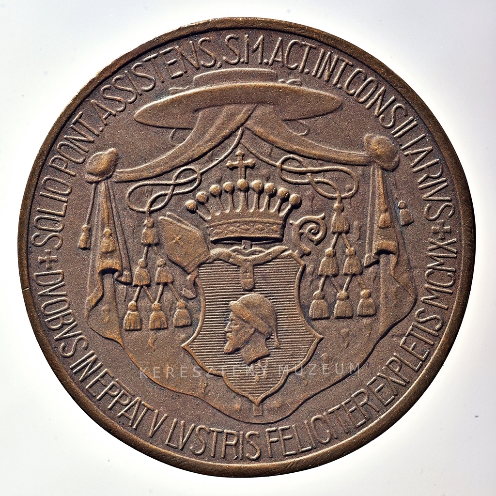 CAROLVS EMANVEL ECOM. CSÁKY D. M. ET. A. S. G. EPISCOPVS VACIENSIVM | SOLIO PONT. ASSISTENS, S.M.ACT. INT. CONSII. IARIVS DVOBVS IN EPPATV LVSTRIS FELICITER EXPLETIS MCMX