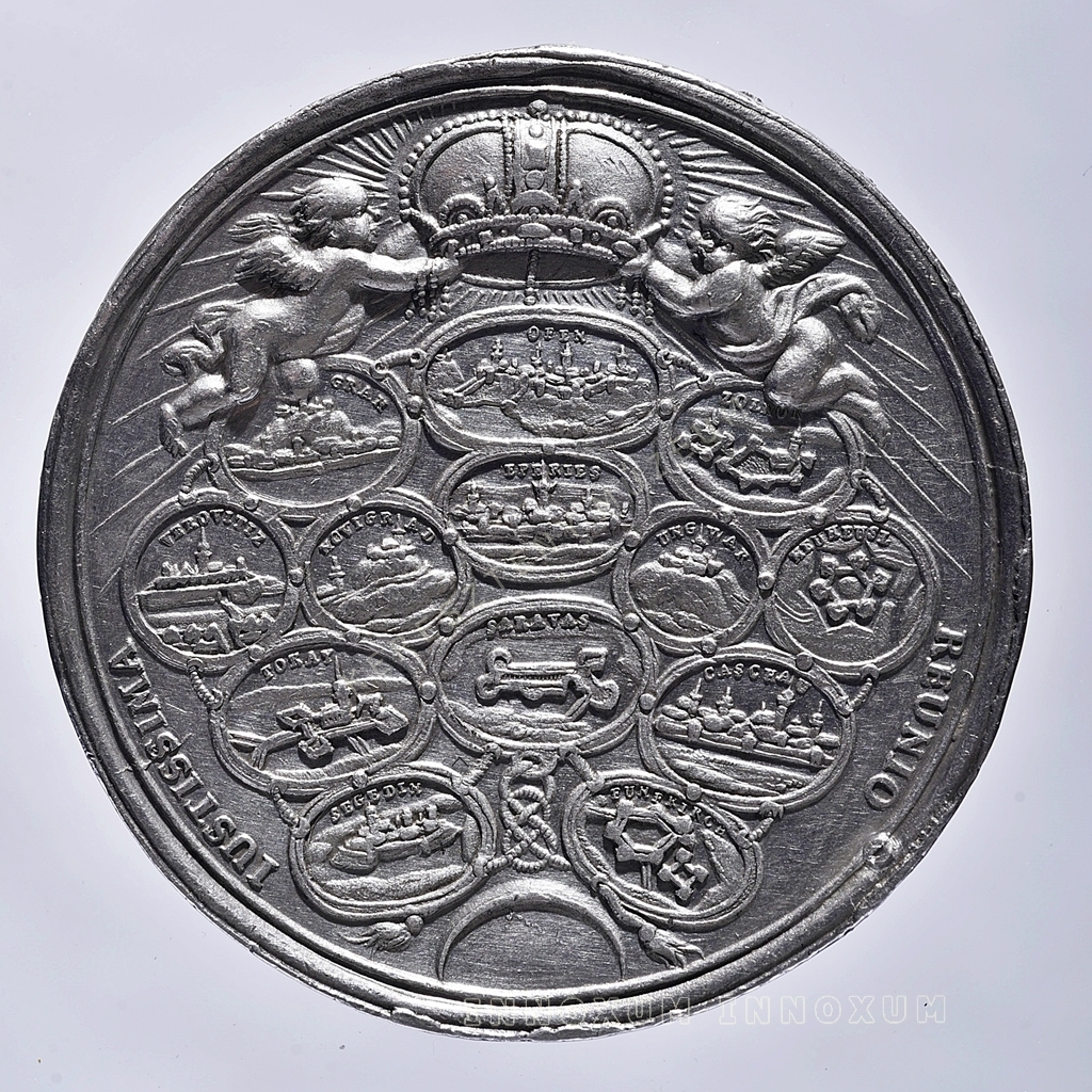 13 felszabadított város, ill. vár látképe, fent két angyal tart császári koronát;
