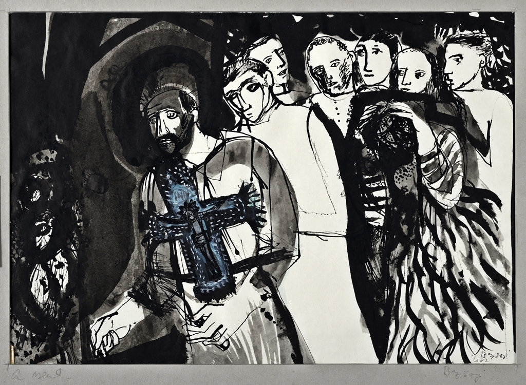 Mellén kék feszületet viselő szakállas, glóriás alak. Mögötte az őt követő tömeg.