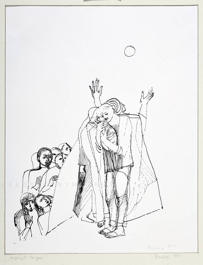 Magához kenyeret szorító férfi és nő; mögöttük háttal álló, turbános alak, két kezét - hálát adva - a nap felé tárja.