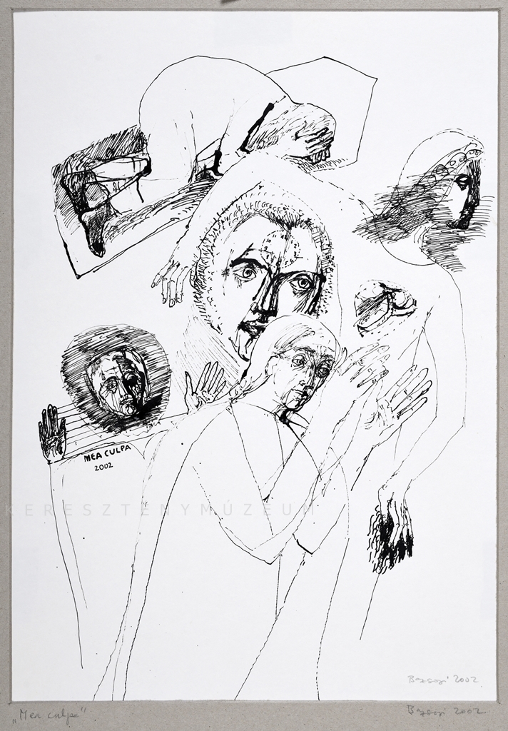 Balra glóriás fej MEA CULPA felirattal, hátul földre boruló, fejét fogó alak.