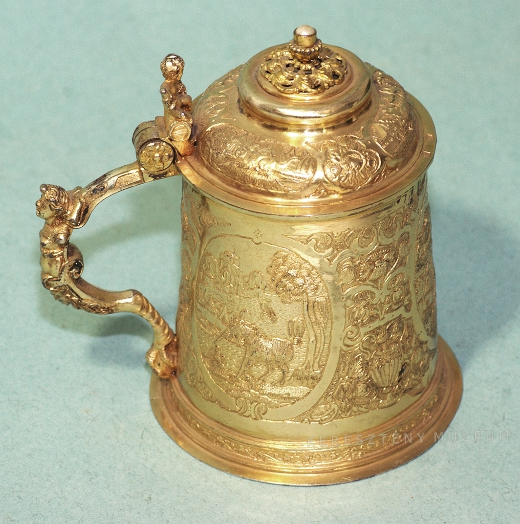 Sellő-alakot formázó fogó felett, foglalatba illesztett igazgyönggyel díszített, csuklós fedél zárja, a talpa felé szélesedő kupát. Oldalán medaillonokban, városkép részletek. A képek között stilizált, vázából kihajtó, bimbózó virágos növény.