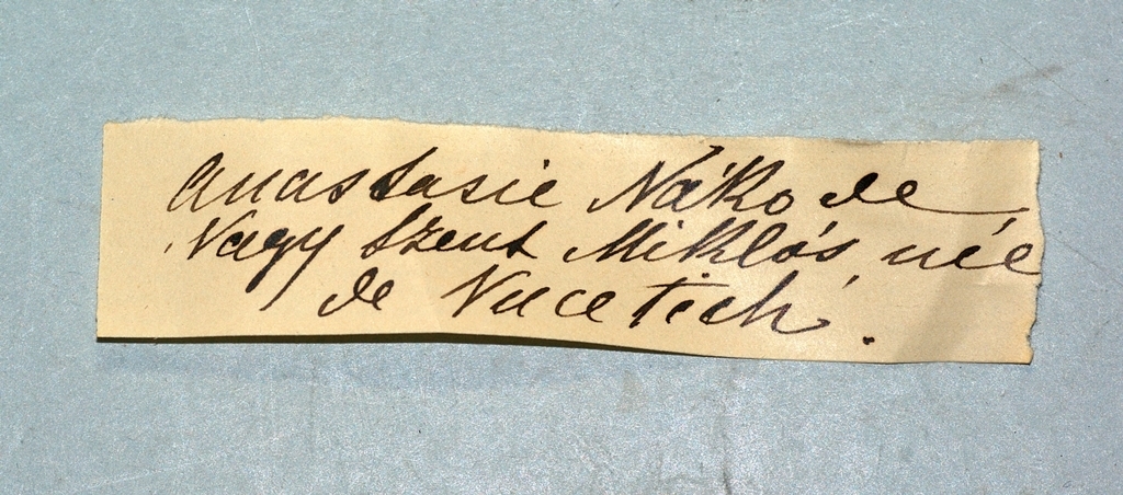 a dobozban kísérő cédula, felirata: Anastasie Náko de Nagy Szent Miklós née de Vucetich
