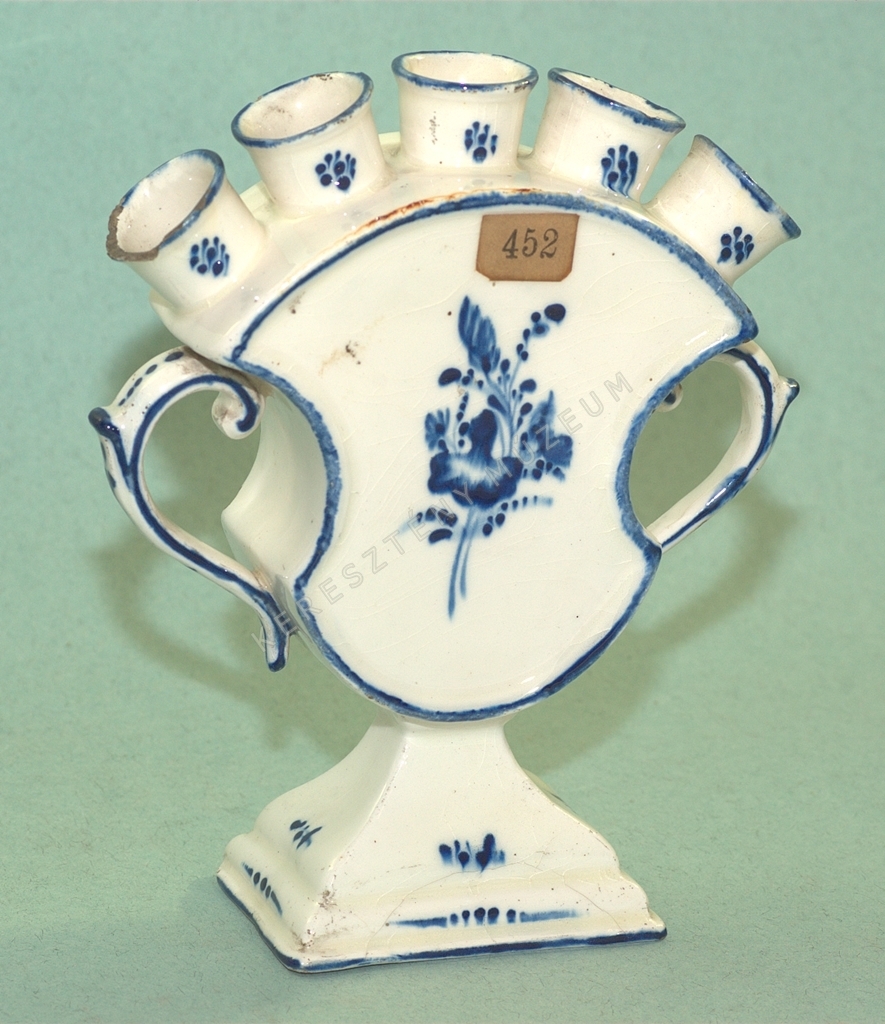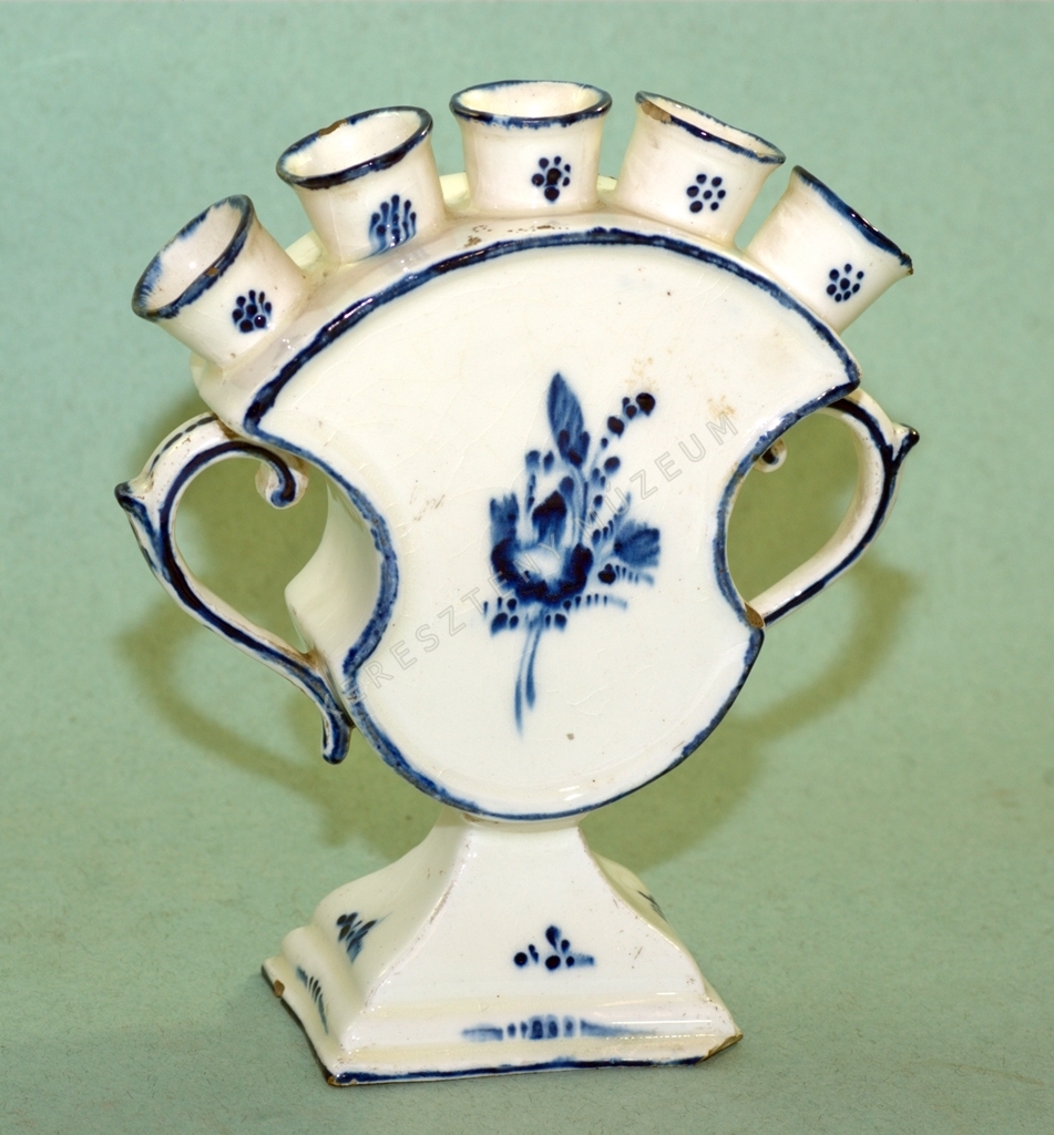 "Tulipános", vagy csöves váza. A testen kialakított öt csövecskébe helyezték el a 18. szd-ban szálanként, az arany-értékű tulipán szálakat.