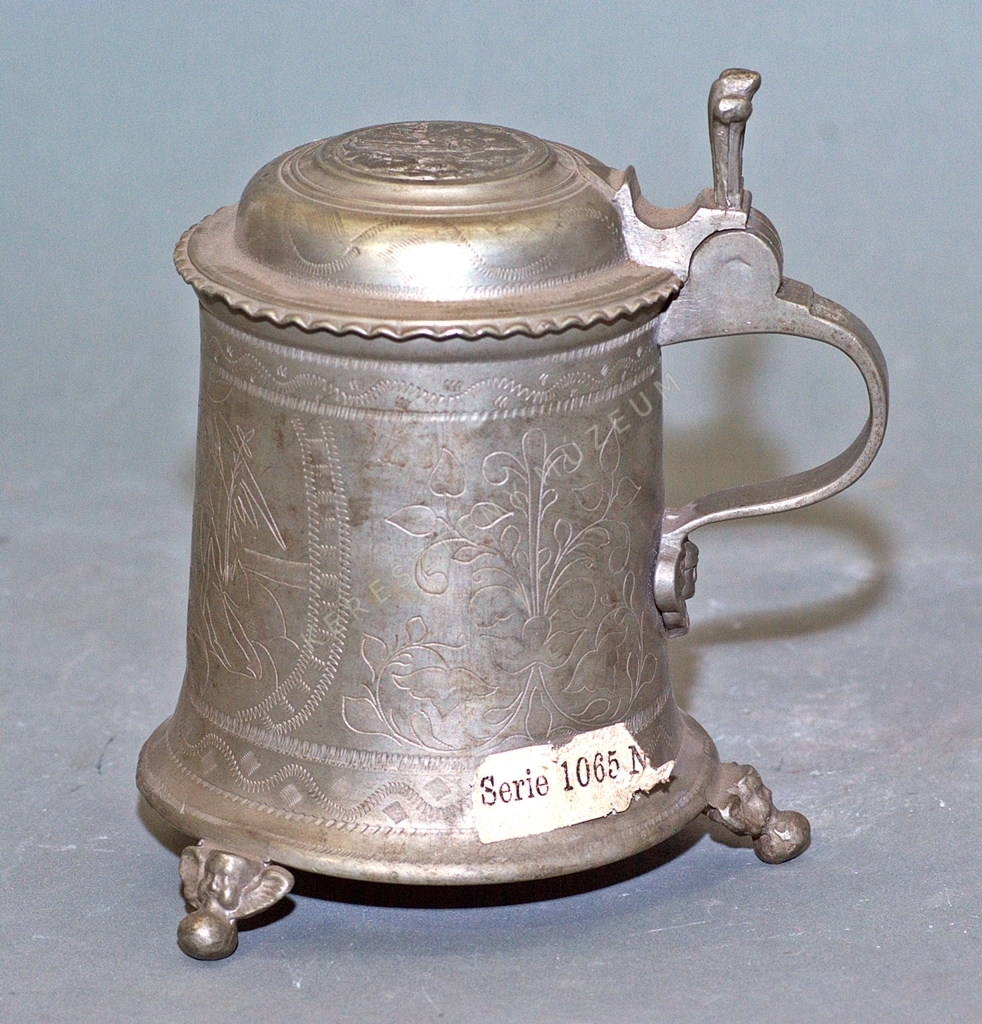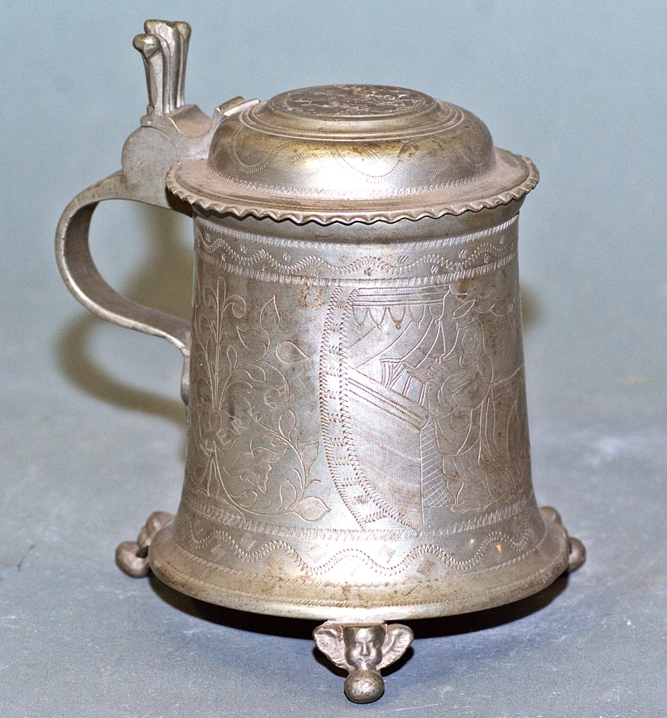 Hengeres, lefelé szélesedő testű, edény, három, angyalfejes lábon áll. Oldalán "Angyali üdvözlet" vésett jelenete.