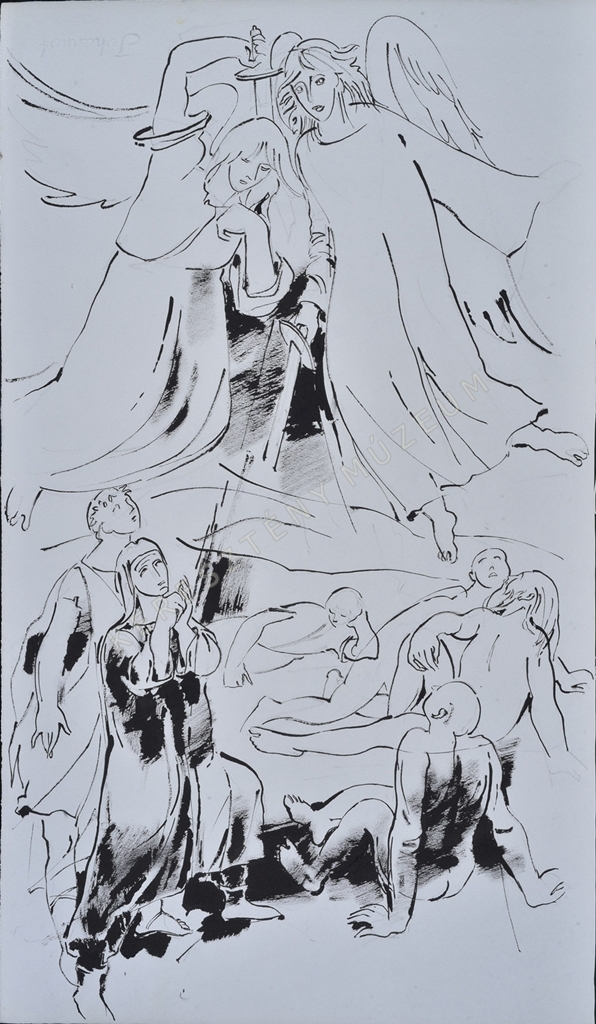 Álló kompozíció: két angyal izzó karddal száll a lelkek felé; balra Vergilius és Dante.