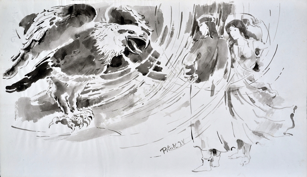 Balra hatalmas, szárnyát kitáró, nyitott csőrű sas látható, amint a jobboldalt egymás mellett álló, feléje forduló Dantéhoz és Beatricéhoz szól.