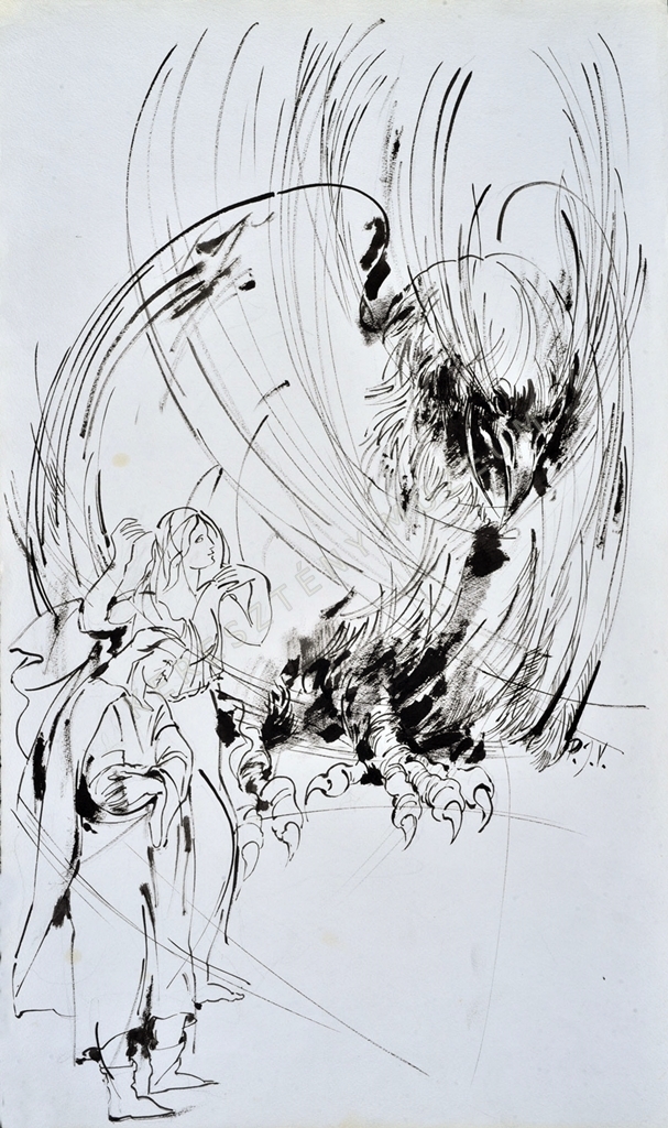 Dante, fejét lehajtva, és mellette Beatrice a kép baloldalán látható: ő a szárnyát föléjük is kiterjesztő, a kompozíció nagyobb részét elfoglaló hatalmas sasra néz.