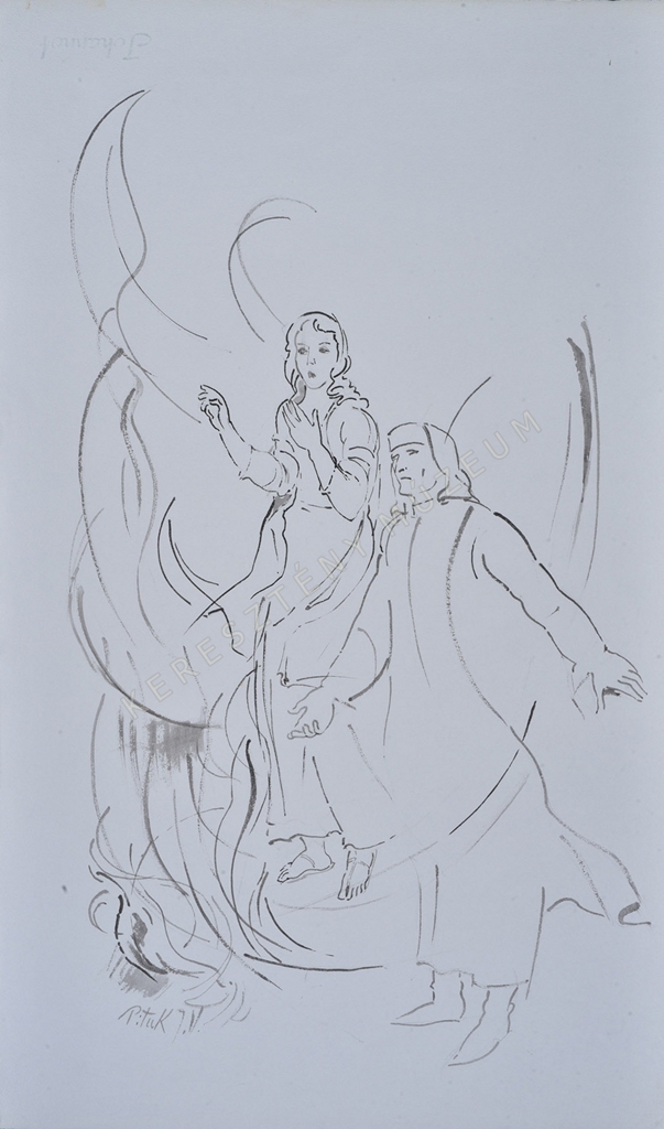 Dante és Beatrice gesztikulálva, egy irányba nézve áll egymás mellett. Dante és Beatrice gesztikulálva, egy irányba nézve áll egymás mellett.