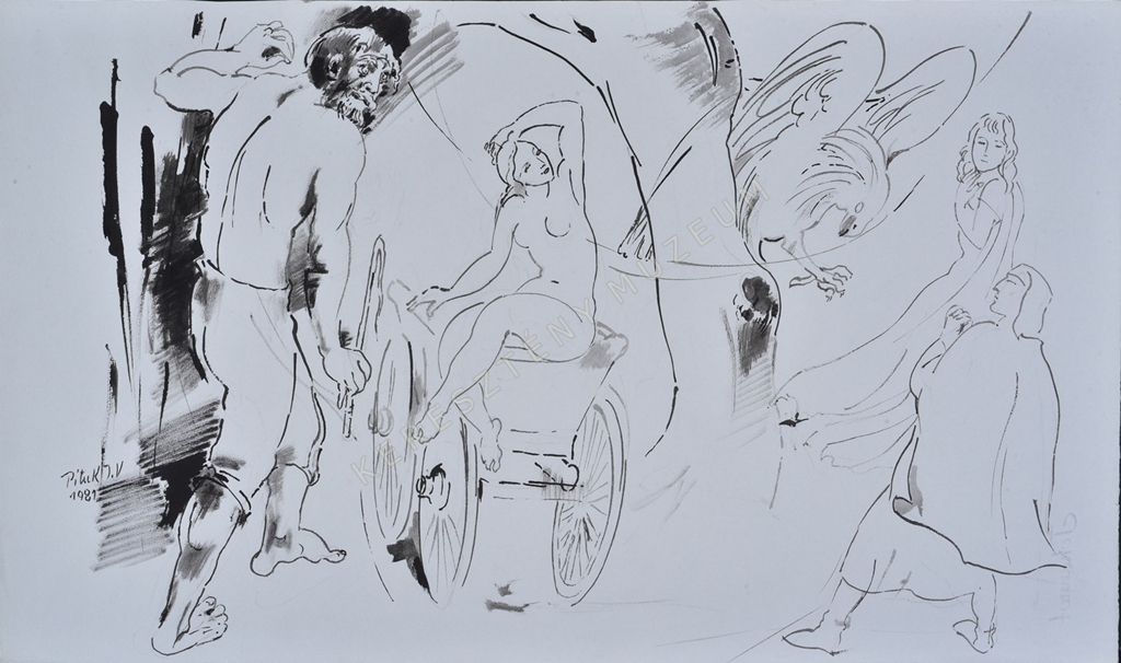 Középen kordén ülő ruhátlan nőalak, balra óriás, ostorral. Jobbra a Griff, Beatrice és Dante.