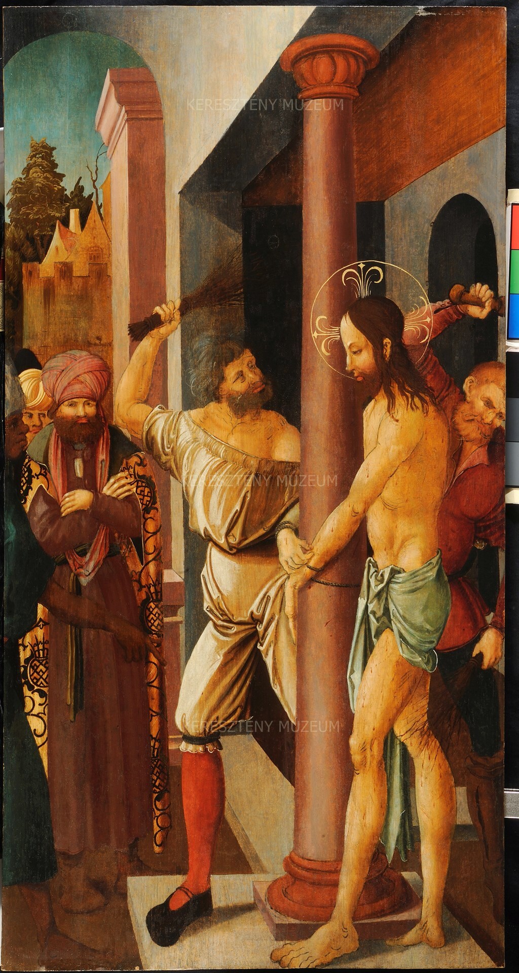 Hat, eredetileg egyazon szárnyasoltár hétköznapi oldalához tartozó táblakép egyike. A Töviskoronázást és az Ecce homót ábrázoló képek eredeti vastagságúak, az egykori merevszárnyakhoz tartozhattak, a másik négy ábrázolás valószínűleg a mozgószárnyak külső oldalát díszítette. A jelenetek mindegyike Dürer kisebbik fametszetű Passiójának megfelelő metszete alapján készült. (Hitetlen Tamás - (Dürer B49), Töviskoronázás (B34), Ostorozás (B33), Gúnyolás (B30), A Kereszt előkészítése (B39), Ecce Homo (B35). A táblák némelyike körülvágott, ez magyarázza a jelenleg köztük levő méretkülönbségeket. 1940-ben egy feltűnően hasonló méretű, Krisztus Pilátus előtt táblát árvereztek Kölnben, a Lempertz Aukciósháznál, amely Isolde Lübecke véleménye szerint ugyanehhez az oltárhoz tartozhatott.